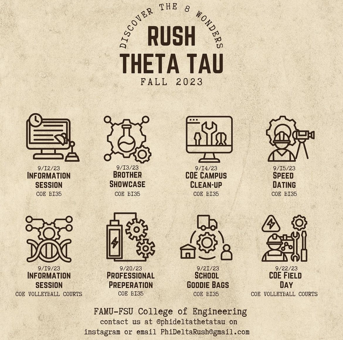 Rushing is a way for you to come out and learn more about our chapter of Theta Tau. You will be able to meet our brothers, and we will be able to meet you. This is how you can decide if you would be interested in becoming a brother and potentially start your pledging process. Rush is usually held during the first few weeks of each semester and typically involves various activities like informational sessions, resume workshops, and social events.We encourage you to come to all events so you can become more acquainted with our brothers, ask any questions that you may have about Theta Tau, and learn about who we are and the upcoming pledge cycle that we would love you to partake in. Below is the rush schedule for the Fall 2023 semester.